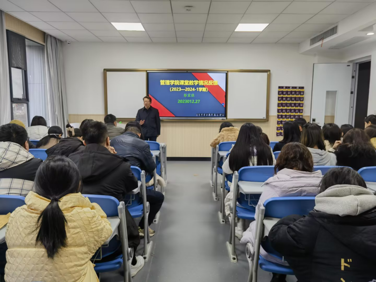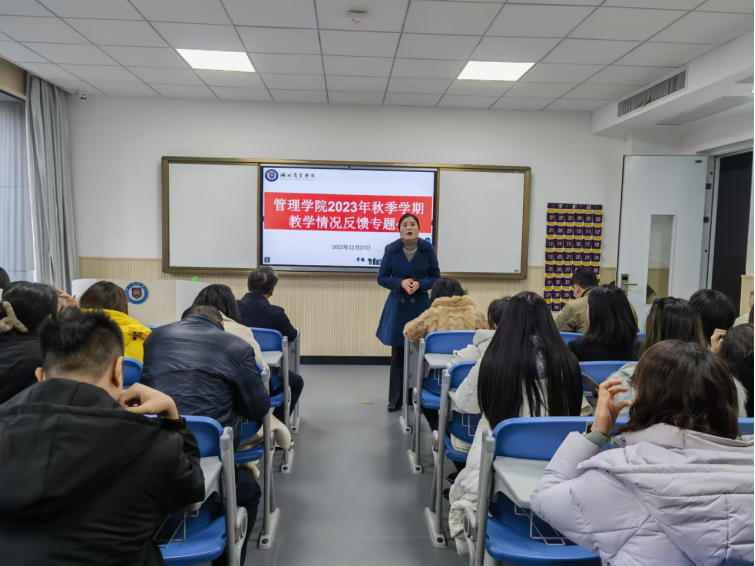 2023年12月27日下午,beat365英国官网网站在鸿博楼205教室召开2023-2024学年第一学期课堂教学情况反馈会,教学质量管理处处长姚晓菊、督导专员彭宜佳受邀参加,beat365英国官网网站经理严良及全院教师出席本次会议,会议由教学副经理孟静主持。