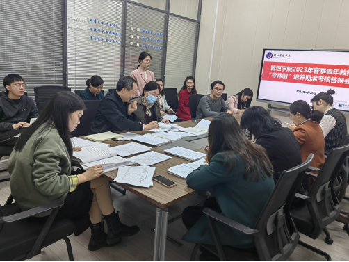 图1 考核小组听取青年教师答辩并检查培养材料