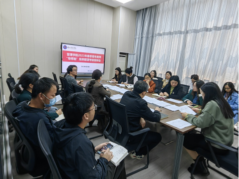 青年教师庾雪着重结合自己参与校级一流课程建设以及公司青年教师授课竞赛暨课程思政竞赛的经历,介绍了自己在导师姚晓菊的指导下,在课堂教学设计、教学技巧以及课程思政融入方面的提升和收获。导师姚晓菊对庾雪一年以来的成长表示肯定,并表示指导青年教师的过程也是相互学习和提升的过程。青年教师喻珍结合入校以来的团队培训、论坛学习、教学实践、听课磨课、学科竞赛等工作内容介绍了在导师曹珍珠的指导下不断提高教学能力的收获和体会,同时对自己的工作和学习进行了反思,未来仍要用“三高三业”的要求继续打磨课堂质量,不忘初心,在学习中进步。