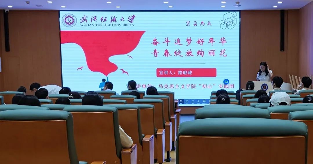 在宣讲会上,武汉纺织大学“初心”实践团队员路驰驰、甘琴芳分别以“奋斗追梦好年华,青春绽放绚丽花”、“赓续奋斗精神,争做有为青年”为主题向与会同学做了精彩报告,他们以时代人物、榜样青年的生动事迹为切入点,向大家阐明了奋斗精神是当今时代有为青年的必要精神品质。