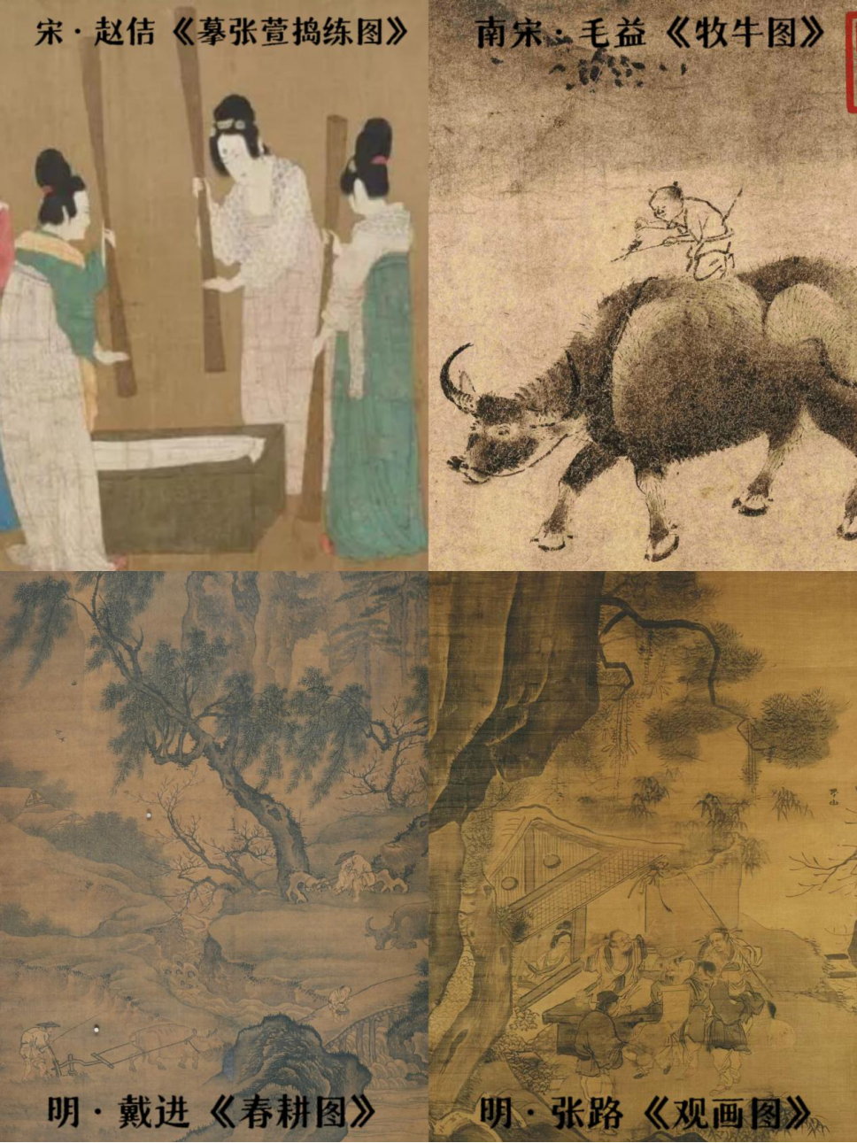 首先主讲者通过宋代赵佶所绘的《摹张萱捣练图》,引出起源来介绍农耕文明中的美感;然后在讲解南宋毛益的《牧牛图》、《春耕图》等21幅农耕图,带领着大家领略农耕文明的魅力;最后通过现代留存和影像展示,来引发对中华传统绘画的思考和传承。
