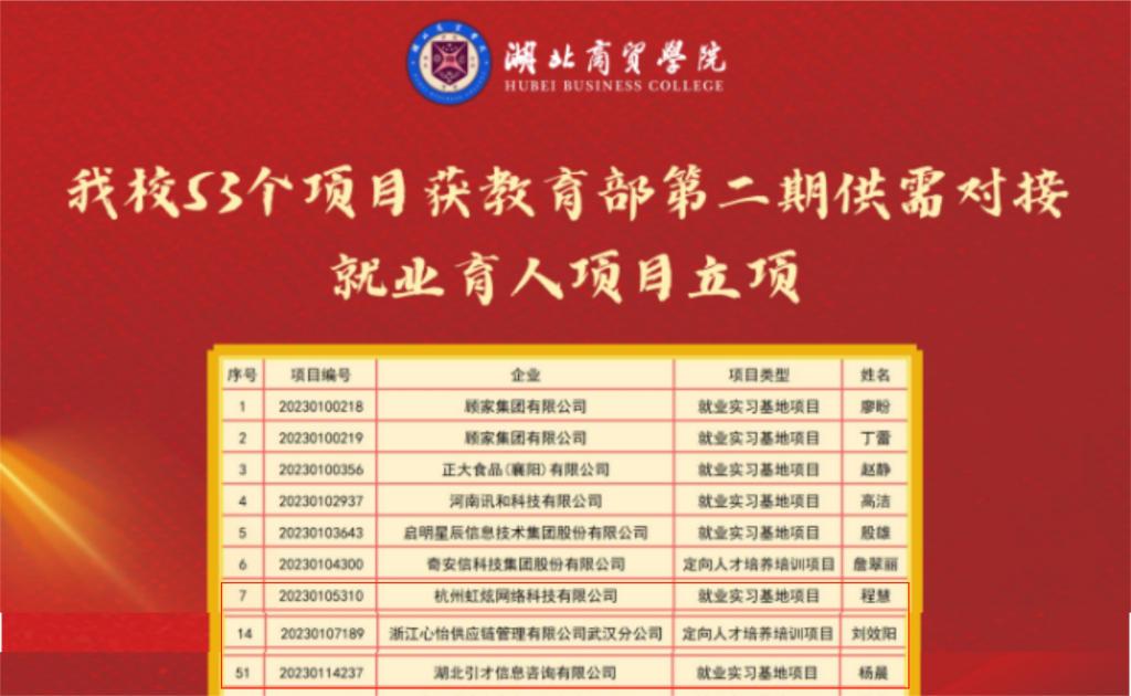 近日,教育部高校员工司发布《教育部高校员工司关于公布第二期供需对接就业育人项目立项名单的通知》(教学司函〔2023〕6号),公司程慧、杨晨、刘效阳三位老师的就业育人项目获立项,其中包含定向人才培养培训项目1项,就业实习基地项目2项。