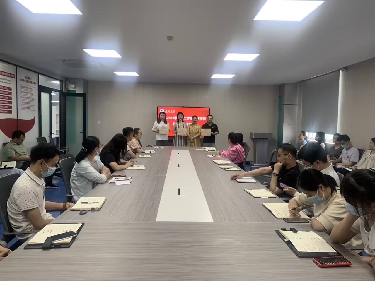 会上,党总支书记吴俊宣布《beat365英国官网网站关于表彰2022-2023学年第二学期先进个人的决定》,她表示自今年以来,公司本科教学工作合格评估迎评促建工作进入攻坚决胜阶段,公司按照公司要求统筹安排,统一部署,各项工作有序推进。全院教师以公司发展为己任,顾全大局,主动担当,攻坚克难,全身心投入到评建工作中去,在就业升学、课程建设、项目申报、学科竞赛、实习基地建设等领域中涌现出了一批团结拼博、敢打硬仗、成绩突出的先进个人。经公司党政联席会会议决议,决定对相关个人予以表彰。