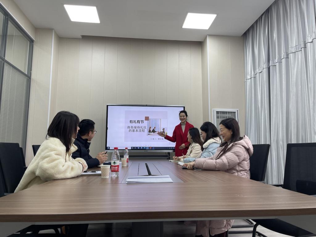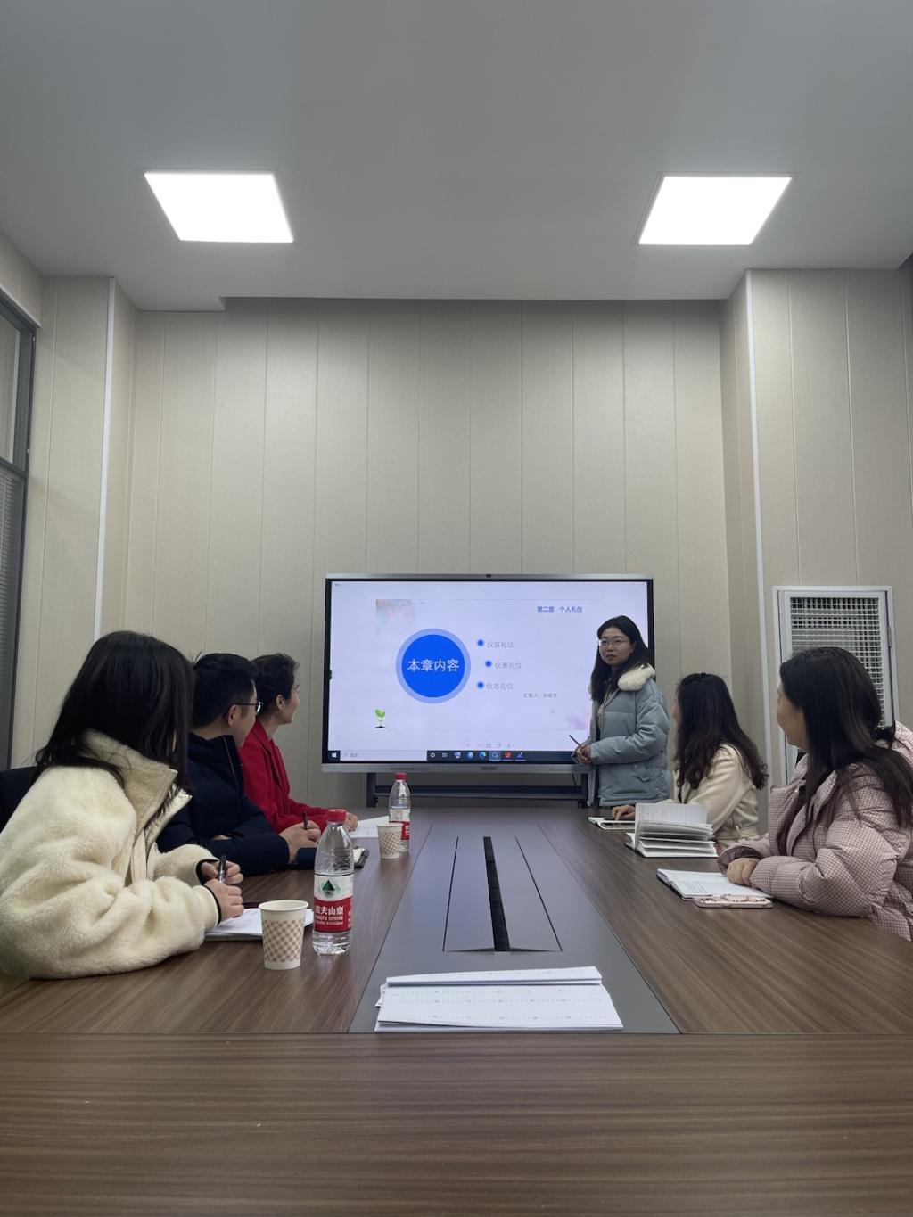 首先,曹珍珠老师围绕课程概述、教学目标、痛点与难点、改革与创新、内容与资源、成效与展望等方面介绍了《现代礼仪》这门课程,并就其中的商务礼仪知识进行了示范教学,条理清晰的介绍了商务接待礼仪的基本流程,引导员工在生活中待人处事做到有礼有节。其他老师一致认为曹老师教学过程感染力强,风格独特,渗透了课程思政,值得学习。