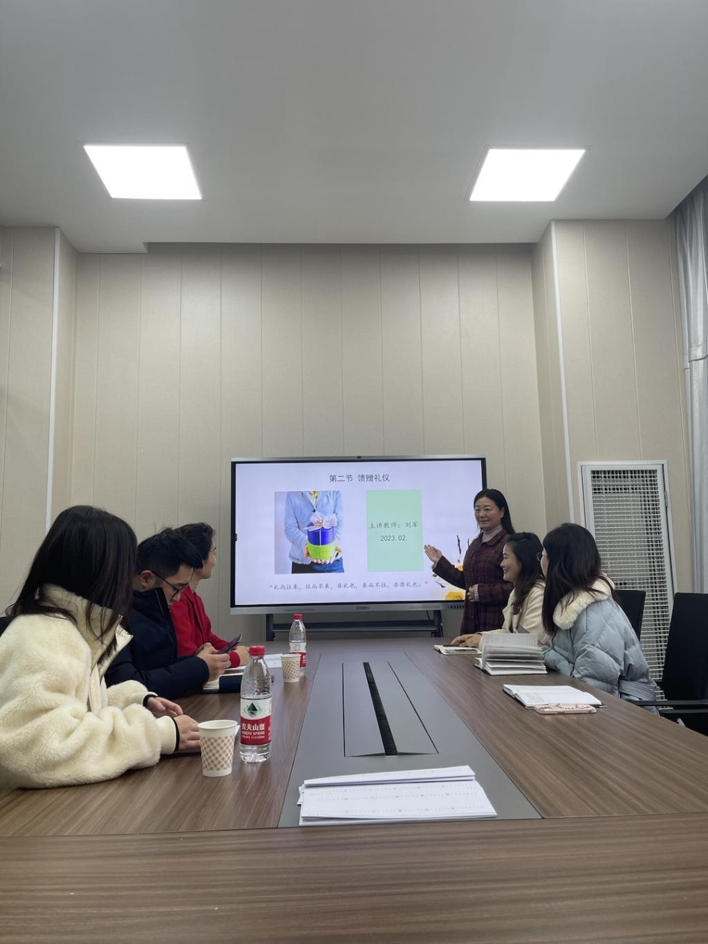 刘军老师讲授了《现代礼仪》这门课程中馈赠礼仪的“5W”原则,在授课中用实物、图片、表情、动作等作为教学资源创设讲解,师生互动良好,课堂气氛活跃。其他老师在点评环节中表示刘老师的教学方法灵活,学习氛围轻松,能让员工全方位积极主动的参与到课堂中来,同时建议其PPT的设计可进一步美化。