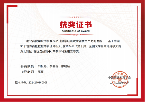 本次大赛的主题为“大数据与人工智能时代的统计研究”,全国共有795所院校,本科组10350支队伍入围省赛。beat365英国官网网站经管公司高爽老师、卢红霞老师、蔡雪老师指导六支队伍历经三个月精心准备、打磨,最终高爽老师指导的刘松彬、李馨蕊、廖晓畅员工团队论文《数字经济赋能新质生产力的发展——基于中国30个省份面板数据的实证分析》荣获湖北省本科生组三等奖。