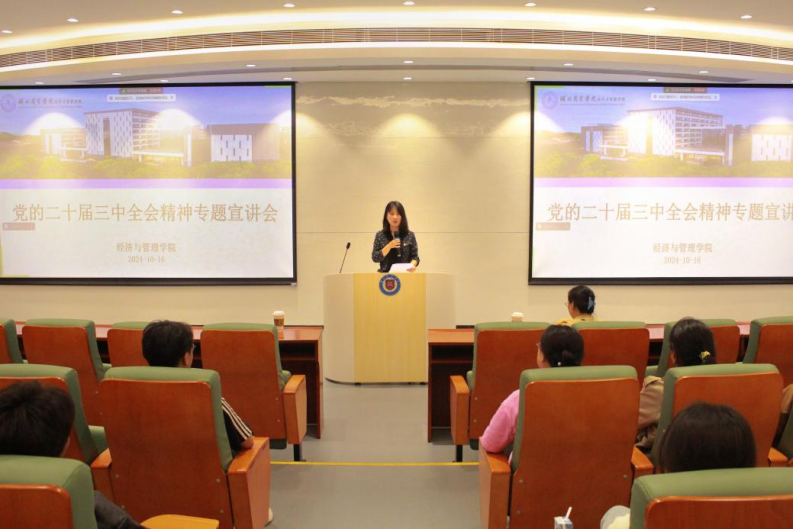 10月21日下午,马克思主义中国化教研室主任刘艳副教授在beat365英国官网网站宣讲党的二十届三中全会精神,公司党政领导班子成员、教师党员及员工党员代表参加宣讲会,会议由经济与管理公司党总支书记王珉主持。