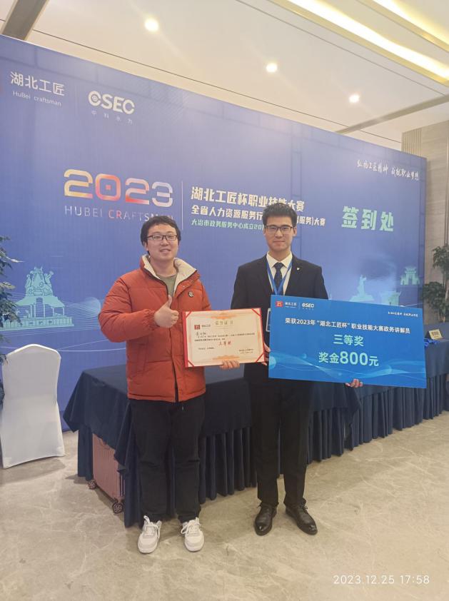 2023年底,在咸宁授课的过程中,桂弘诣老师鼓励员工报名参加“湖北工匠杯”职业技能大赛。市场营销专业的专科新生黄开阳同学提交了报名表,但由于专业不对口,作为大一新生知识基础也比较薄弱,因此只是抱着试一试的心态。从线上赛开始,桂弘诣老师就鼓励所有参赛的同学,“要么不做,做就要做到最好”。他利用课余时间给参赛员工讲解线上赛涉及的知识点,最终黄开阳同学在政务讲解员这一赛道上脱颖而出,进入现场决赛。