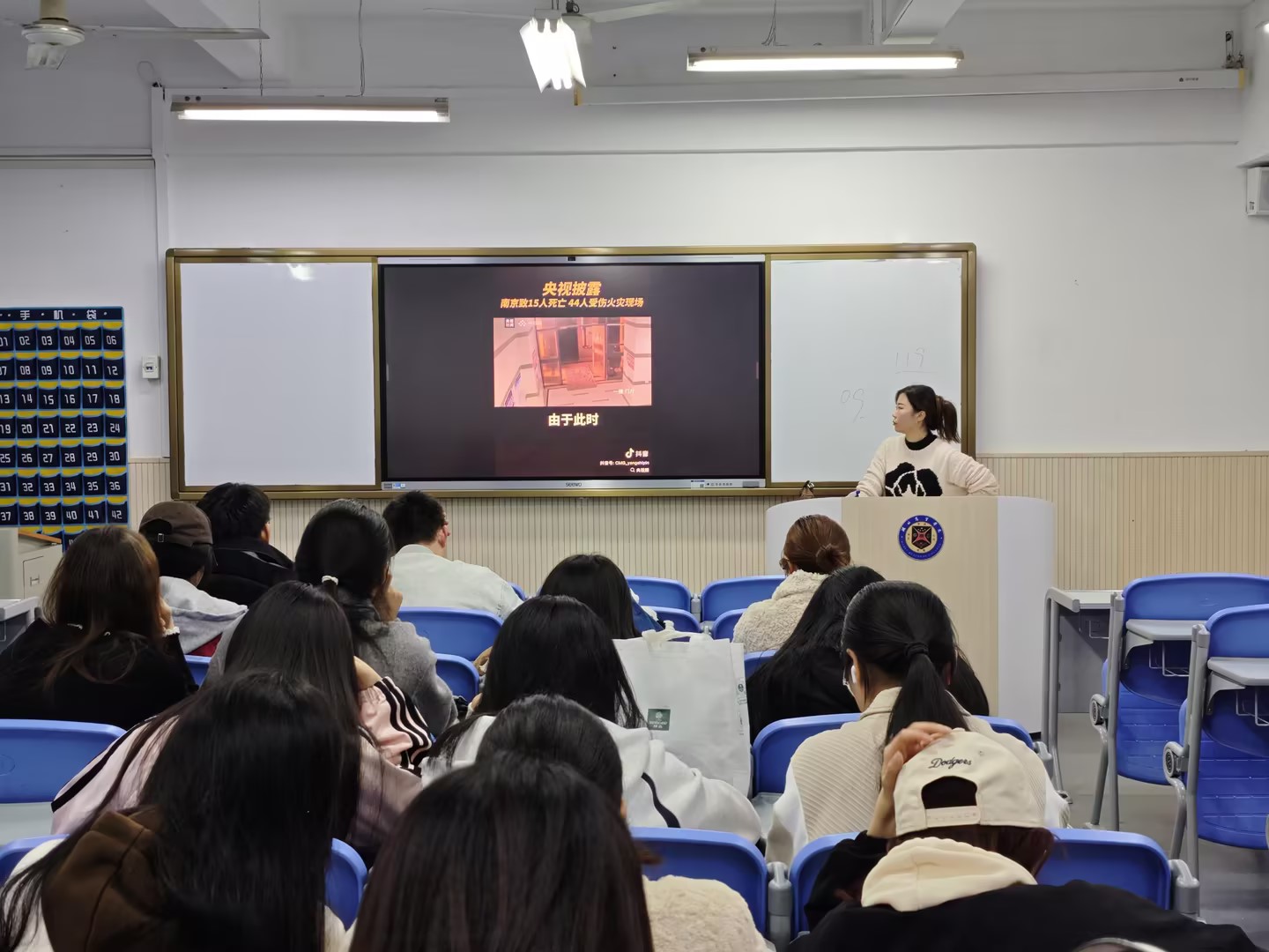 各班级现场互动讨论氛围热烈,员工们围绕“身边常见消防隐患”“如何规范用电用火”等话题积极发言,24金融本1班田子童同学的发言引发全员共鸣:“之前常在楼道见到未灭烟头,视频里火苗快速蔓延的场景太惊心,现在见着必随手踩灭,还会主动提醒身边人!” 大家围绕校园潜在隐患热烈讨论,最终将消防意识深植于心,转化为规范充电、杜绝隐患的行动自觉,让安全理念渗透校园与生活每个角落,共同筑牢生命安全防线。