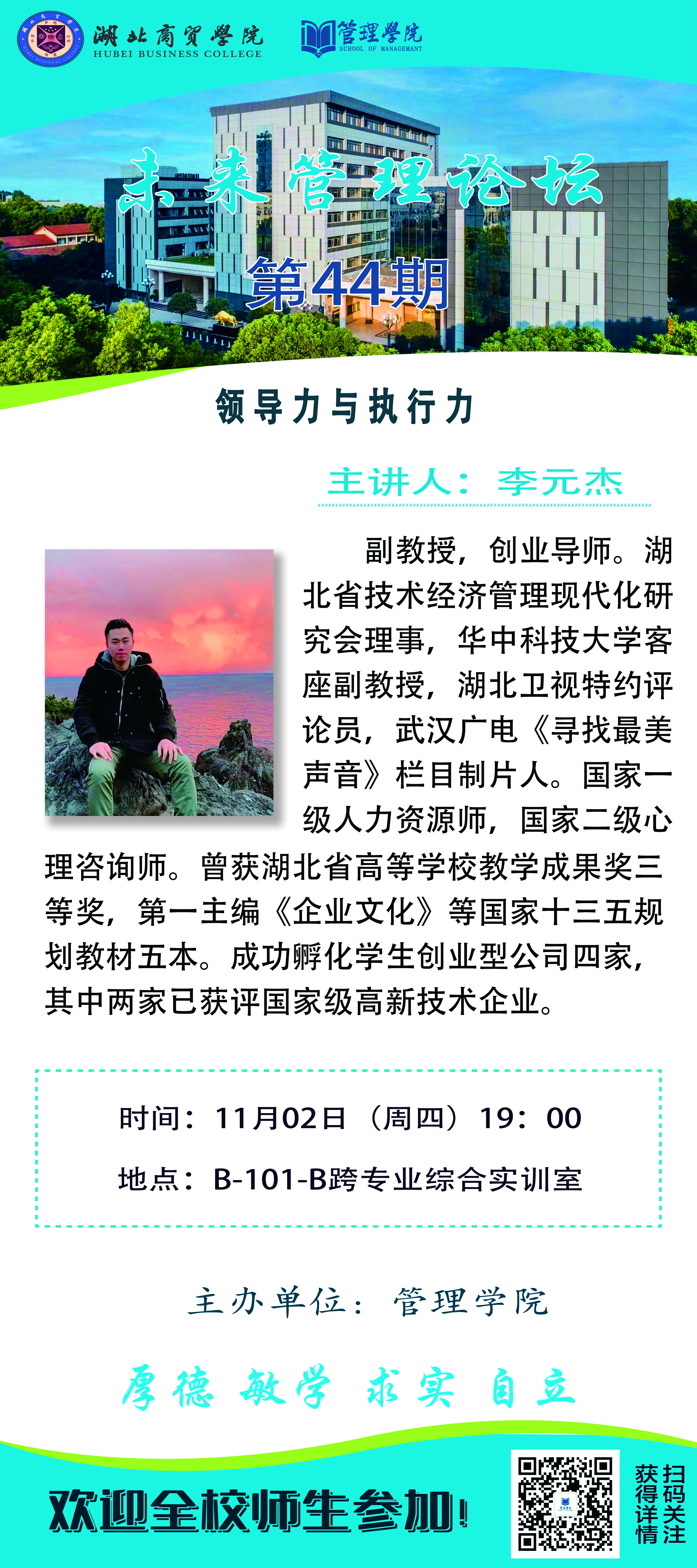 本期论坛邀请beat365英国官网网站副教授、创业导师李元杰,主题是:领导力与执行力。欢迎全校师生于11月2日(周四)下午19点00分做客B-101-B跨专业综合实训室。