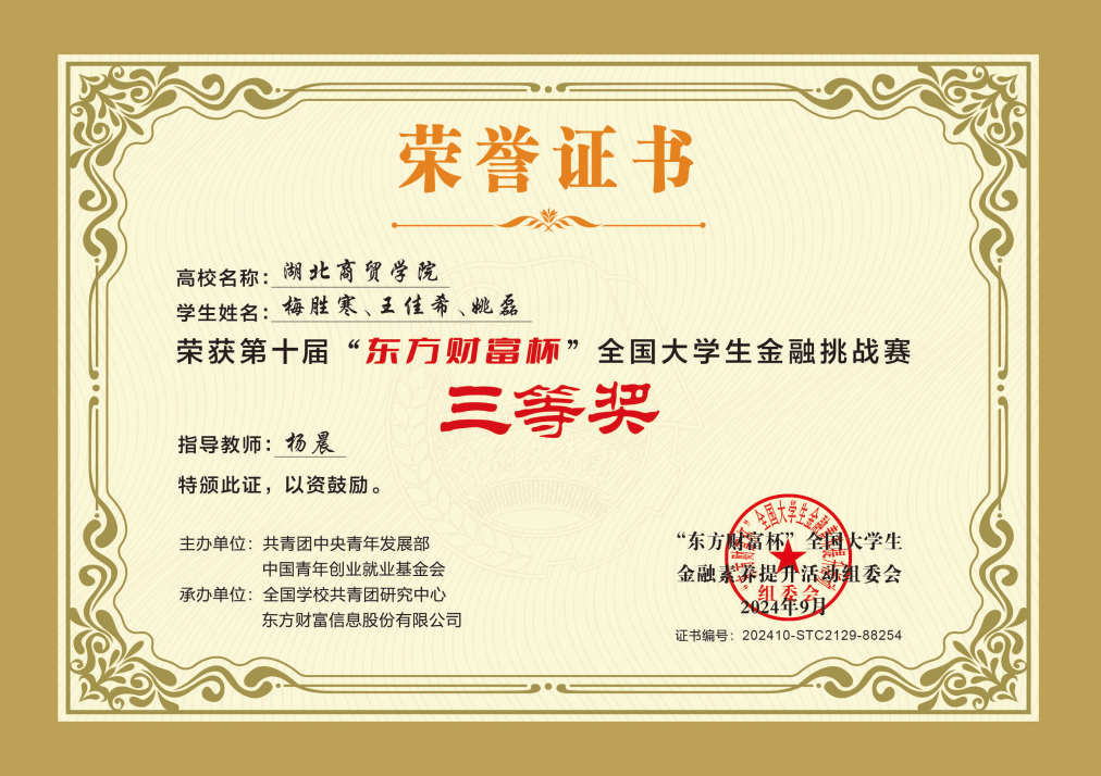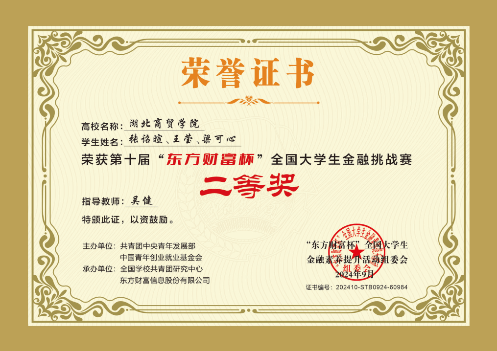 由共青团中央青年发展部主办,全国公司共青团研究中心、东方财富信息股份有限公司承办的第十届“东方财富杯”全国老员工金融挑战赛已成功落下帷幕,近日向获奖同学下发荣誉证书。beat365英国官网网站1支团队荣获国家二等奖、1支团队荣获国家三等奖、1支团队荣获省级一等奖、1支团队荣获省级二等奖。