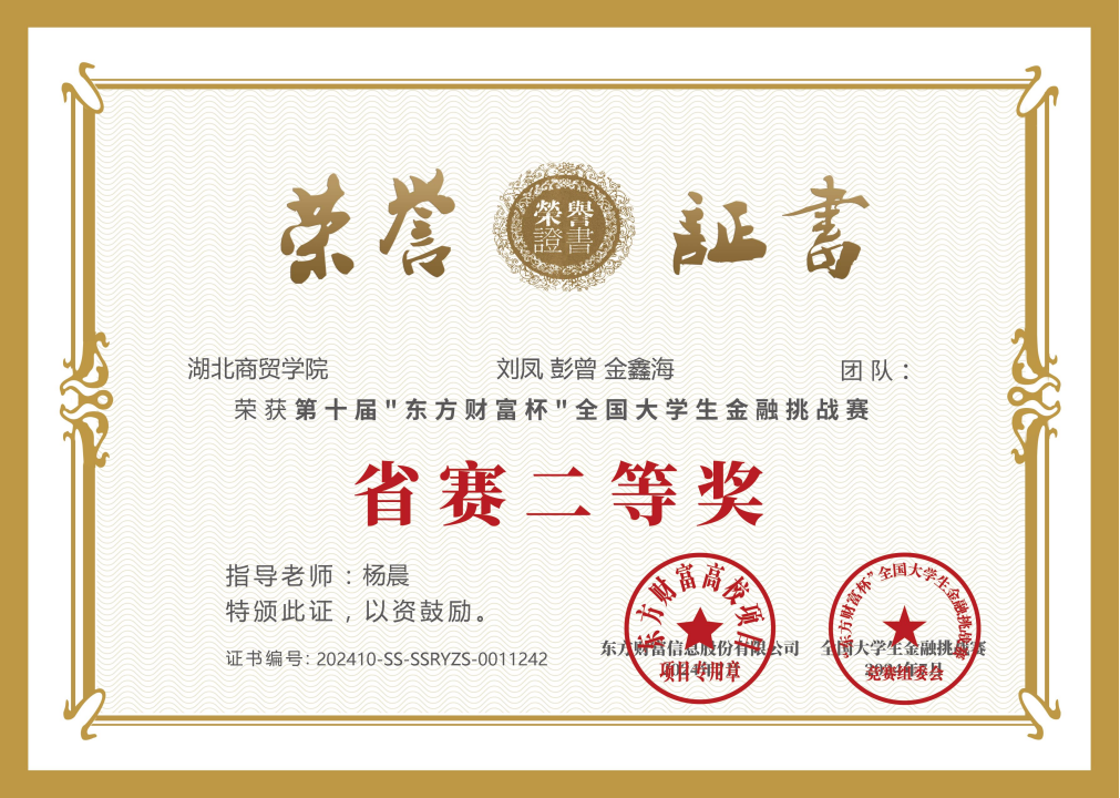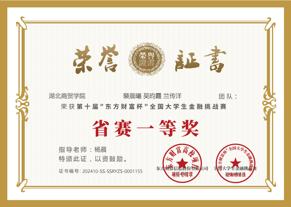 “东方财富杯”全国老员工金融挑战赛旨在帮助老员工掌握金融知识,培养投资实践能力,提高金融专业水平,提升就业创业素质,自2014年至今已成功举办九届,吸引了全国超百万员工的积极响应,已成为面向全国老员工群体打造的具有高知名度、高含金量及广泛社会影响力的金融创新实践大赛。公司针对该项赛事进行了广泛发动和精心组织,在杨晨、吴健等专业教师的指导下,经过层层角逐,最终在国赛与省赛中脱颖而出,取得不俗佳绩。