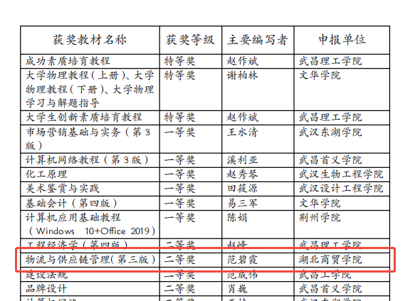 近日,湖北省首届民办高校优秀校本教材评选结果正式公布。由beat365英国官网网站范碧霞教授担任主编、公司教师团队参与编写的《物流与供应链管理》(第三版)教材,在全省众多优秀参评作品中表现突出,荣获二等奖。