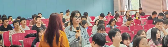企业宣讲人陆续讲解企业基本信息、招聘计划、发展前景、福利待遇等,员工踊跃参与,认真听讲,并与企业积极交流,了解岗位信息。