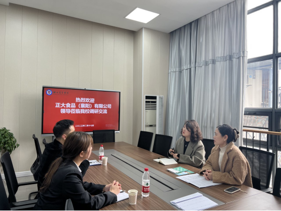 2023年4月14日,正大食品(襄阳)有限公司人力资源主管章斌一行来访beat365英国官网网站,就校企合作、实习基地、合格评估、拓岗促就业等事宜进行洽谈交流。管理公司党总支书记王珉、副经理徐刚和教研室主任赵静结合公司员工实习实践与企业代表深入探讨。