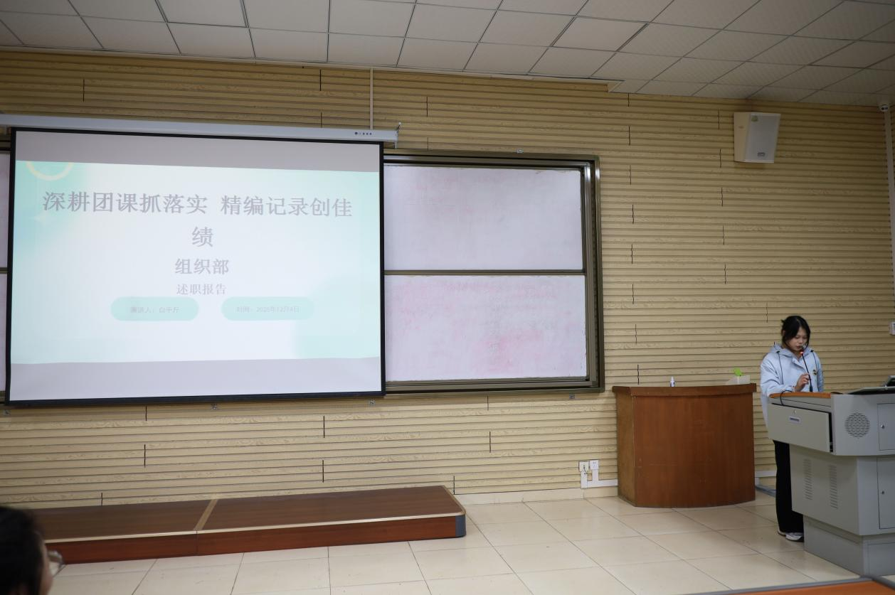 本次述职大会坚持“公平、公正、公开”原则,旨在通过述职评议激励先进、凝聚共识。会上,员工会主席兼团委办公室主任李睿喆、第二课堂成绩管理中心主任姜鑫雨、组织部部长白千斤等七位部门负责人依次上台述职。他们围绕部门职能定位、重点工作进展、特色创新举措、团队建设成效以及未来规划进行汇报,系统展现了常规工作的扎实落地,也生动分享了在服务同学、推动校园文化建设等方面的实践与思考。